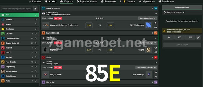 O 85E oferece uma grande seleção de opções de apostas em e-sports com probabilidades competitivas